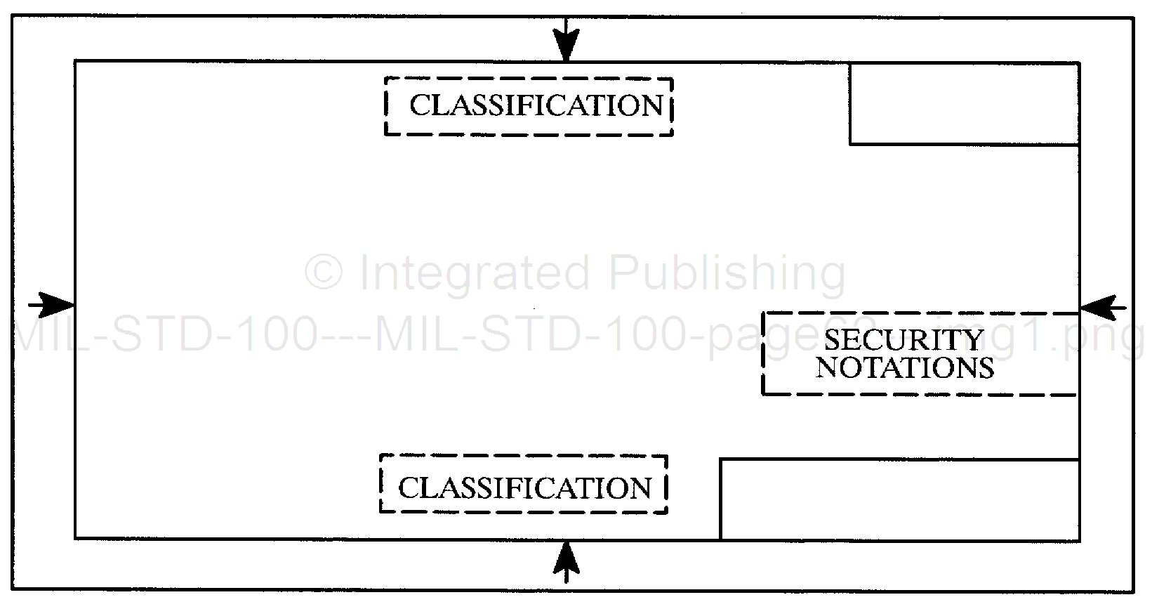 A40.1.5 Location of security markings on drawings. Security notations, such as espionage, special security and downgrading notes, shall be placed above the title block on classified drawings. Security classification shall be located within the body of the drawing (other than roll size) above and below the microfilm arrows. See Figure A-2. For sample location on roll size drawings, see Figure A-3.